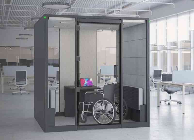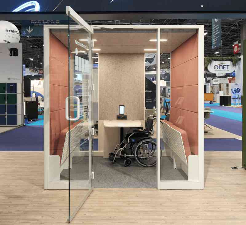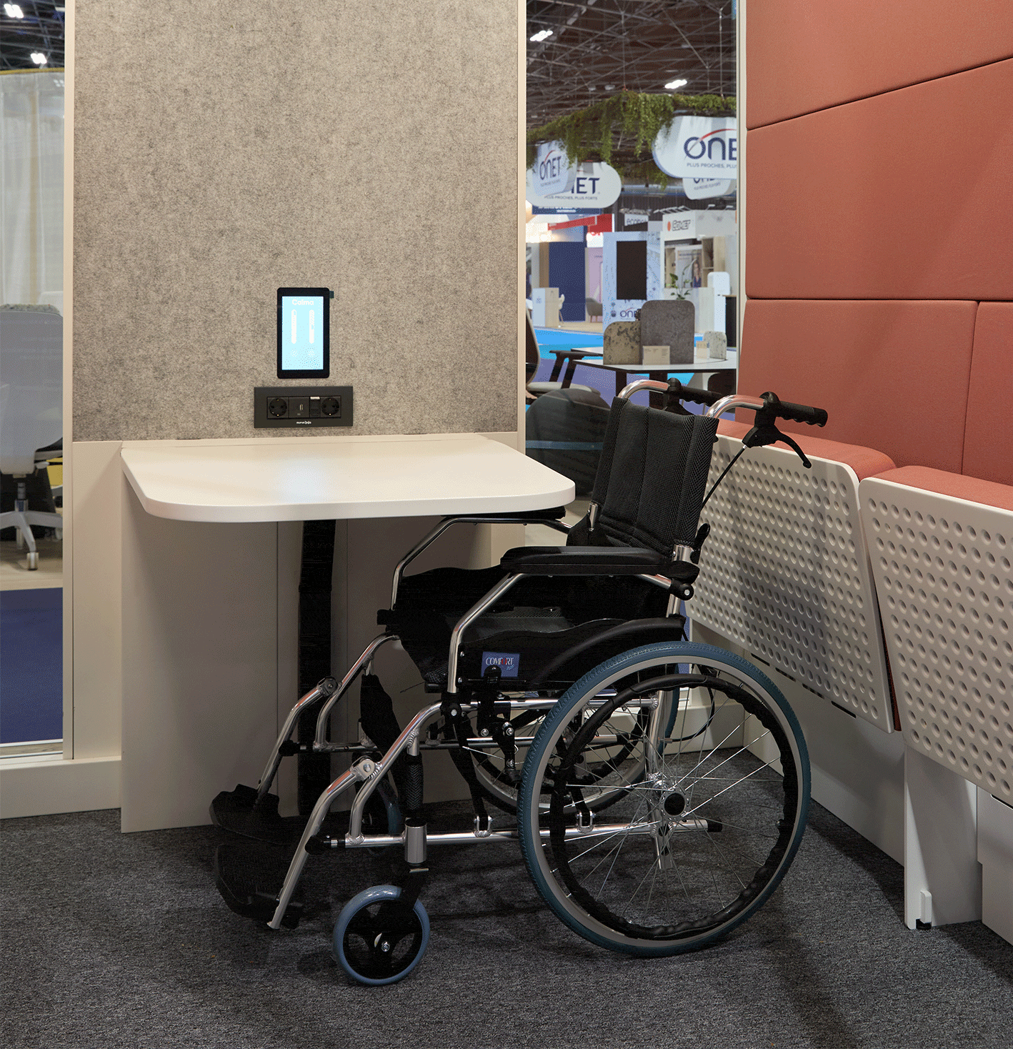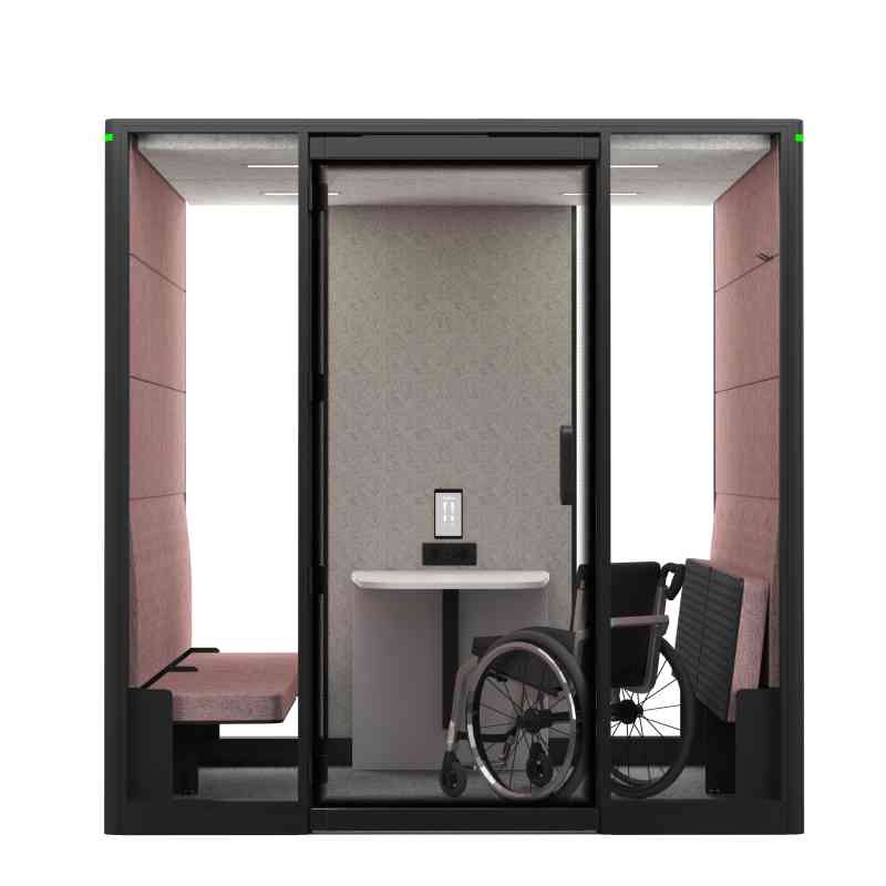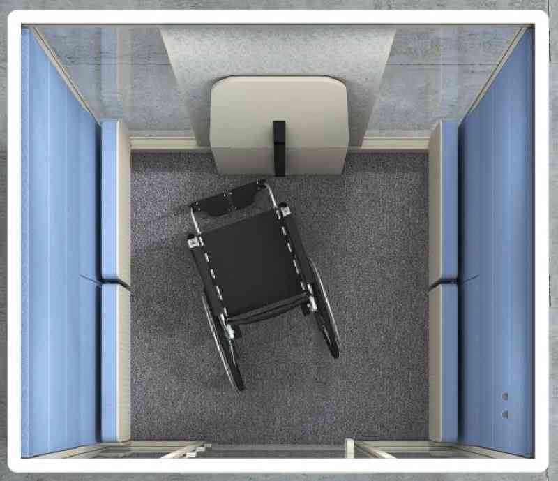 Der sorgfältig gestaltete Innenraum von Calma FOR ALL verfügt über automatisch einklappbare Elemente. Sowohl Bänke als auch Tisch lassen sich dank gedämpfter Mechanik mühelos klappen. Das grosszügige Layout ermöglicht eine kreisförmige Bewegung mit dem Rollstuhl und erfüllt die Anforderungen der ADA-Standards für barrierefreies Design von 2010, Abschnitt 304.3.1, bezüglich der notwendigen Wendeflächen.